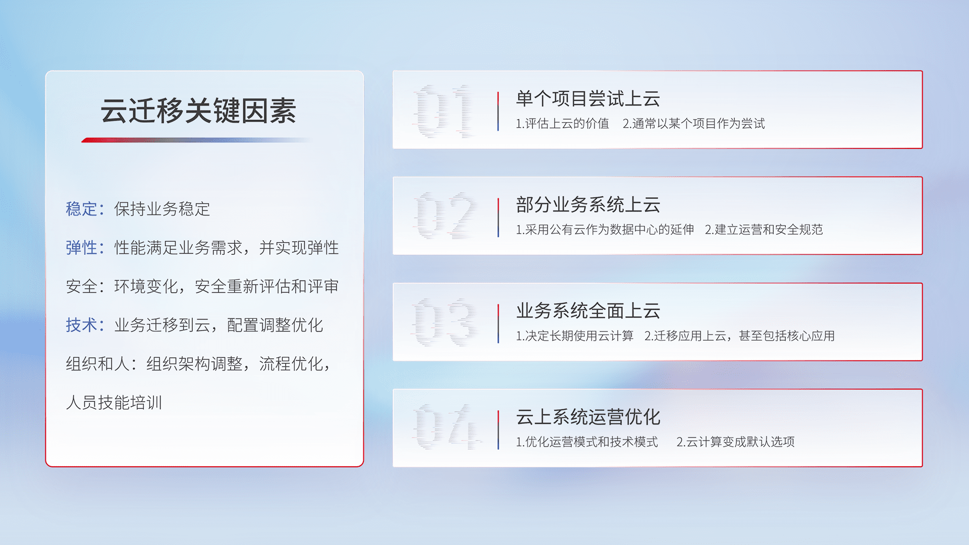 结合实际业务,,,从规划设计、、、云平台选型、、云原生改造、、数据迁移、、、、集成交付,,,迁移全过程为客户识别最佳上云路径,,,做好风险识别管理,,设计网络架构、、、身份权限、、、、安全审计合规、、、操作审计、、、、日志审计、、、、监控告警策略、、多站点容灾设计等,,对云上基础设施进行整体规划,,,,提升IT治理水平,,以满足弹性、、高可用、、、、高性能的需求。。。