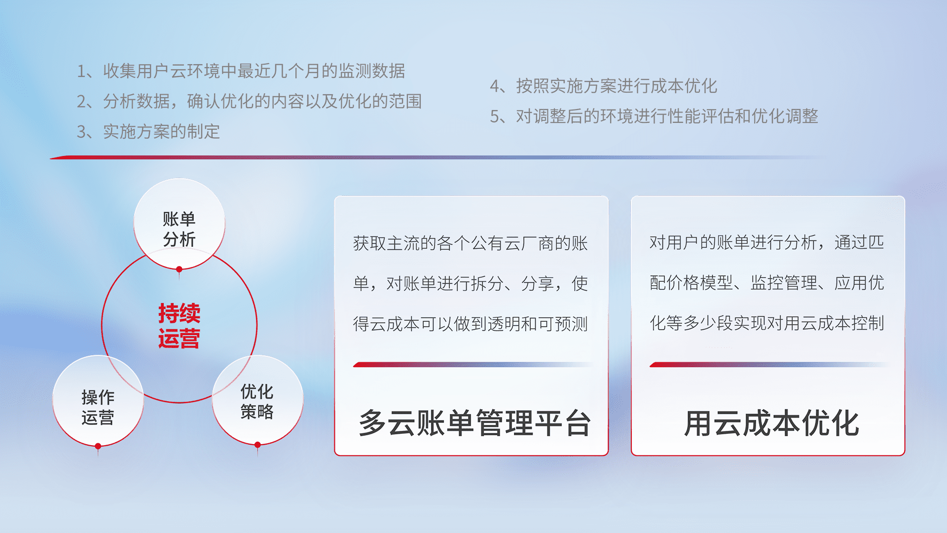 通过多云纳管,,,,以统一的资源数据模型把客户的云资源进行抽象和封装,,进而实现对多云资源的统一操作,,,,保障云资源管理的可靠性、、稳定性与可用性。。。量身定制化运维内容,,,配置、、开发运维、、补丁管理、、、、备份、、、监控、、、、认证和访问管理、、审计和日常巡检等,,,,保障在用云过程中的可靠度,,稳定度以及高可用率。。。。